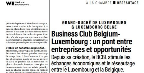 We are pleased to announce the publication of an article on the Business Club Belgium-Luxembourg (BCBL) in Entreprendre, the magazine of the Chambre de Commerce et d’Industrie Luxembourg-Belge (AKT CCI Luxembourg-Belge). The article highlights the BCBL’s role as a bridge between Belgian and Luxembourgish companies, as well as its commitment to fostering economic exchanges, networking, and bilateral business opportunities.